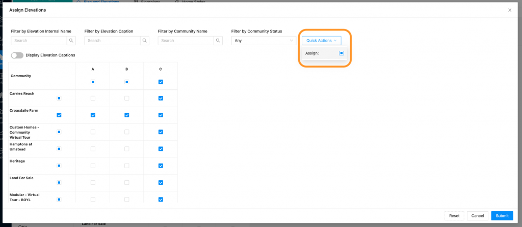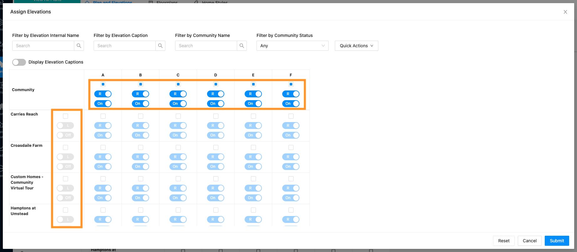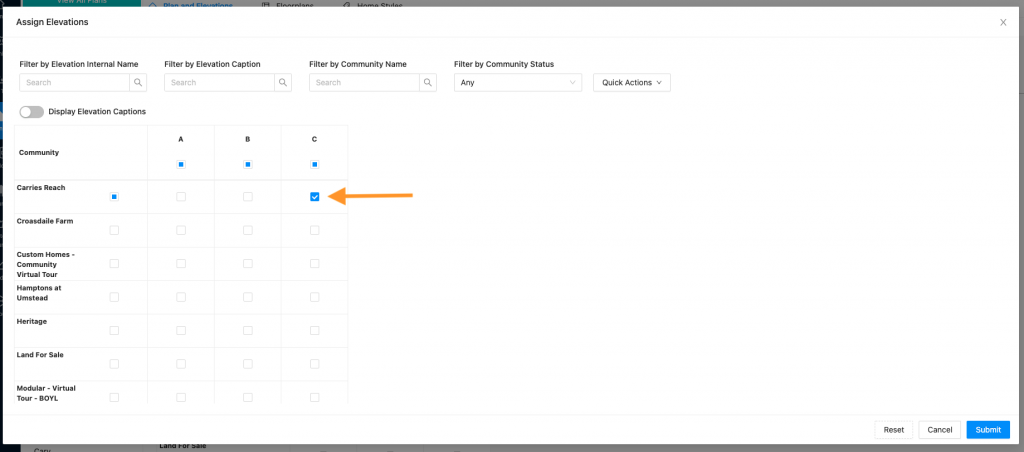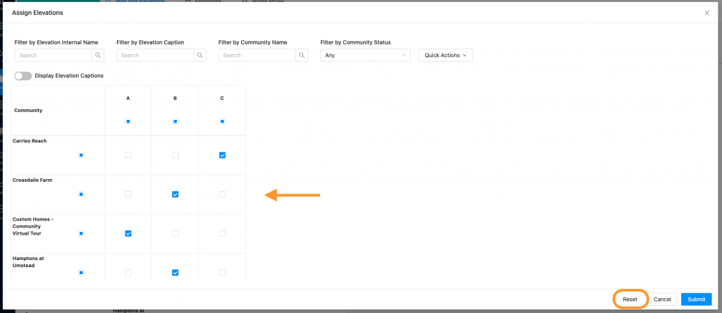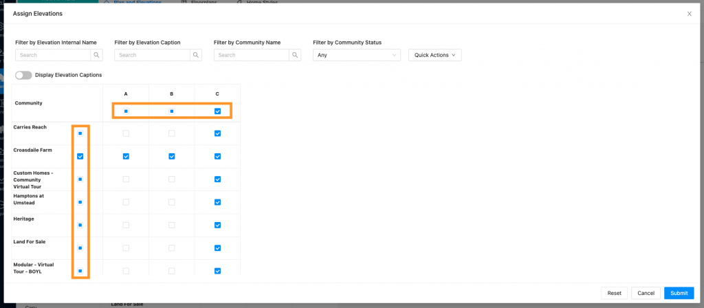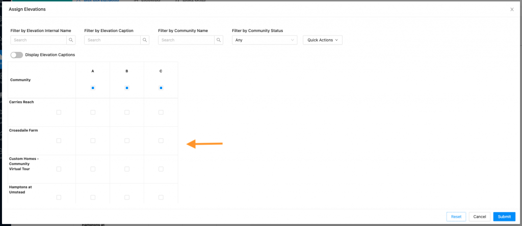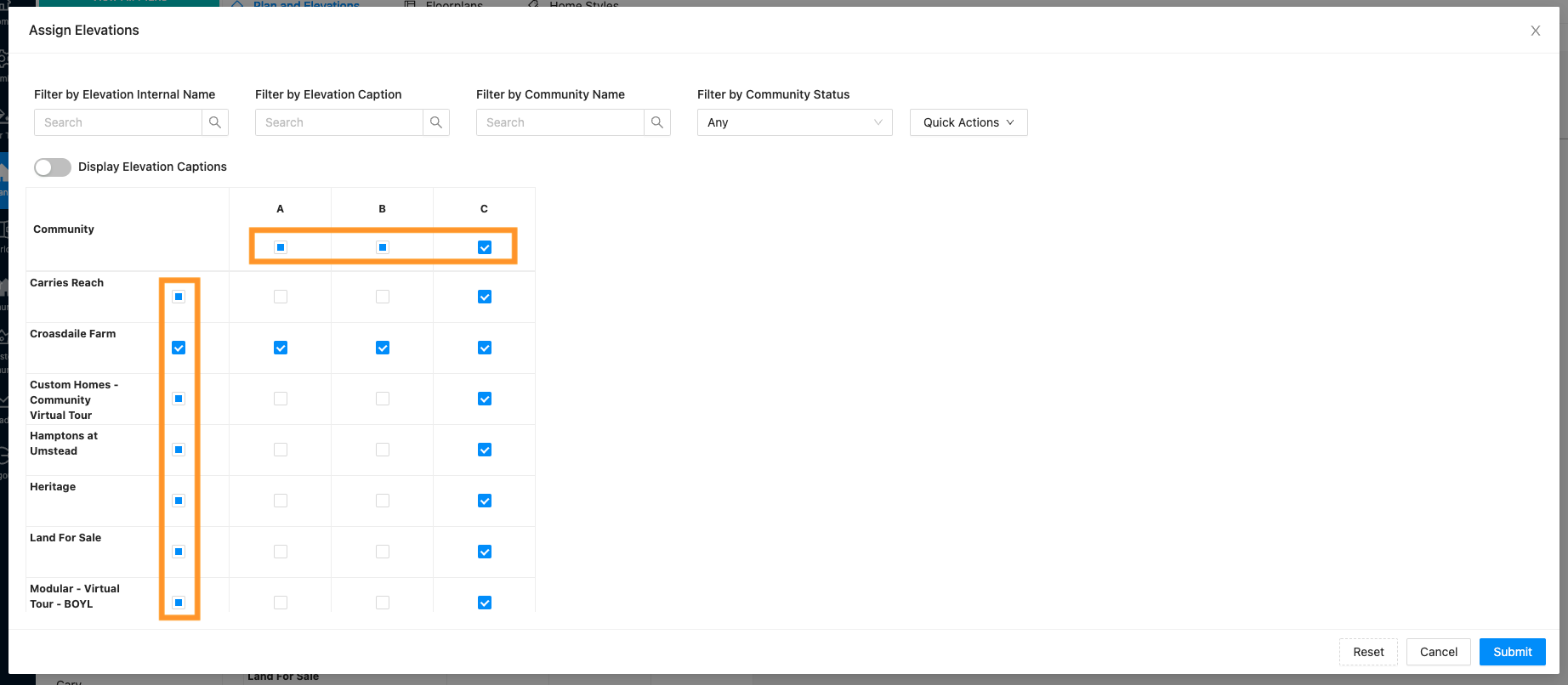 8. The checkboxes under the community names on the left side column and the checkboxes under the elevation names on the top row function as “Select All”
