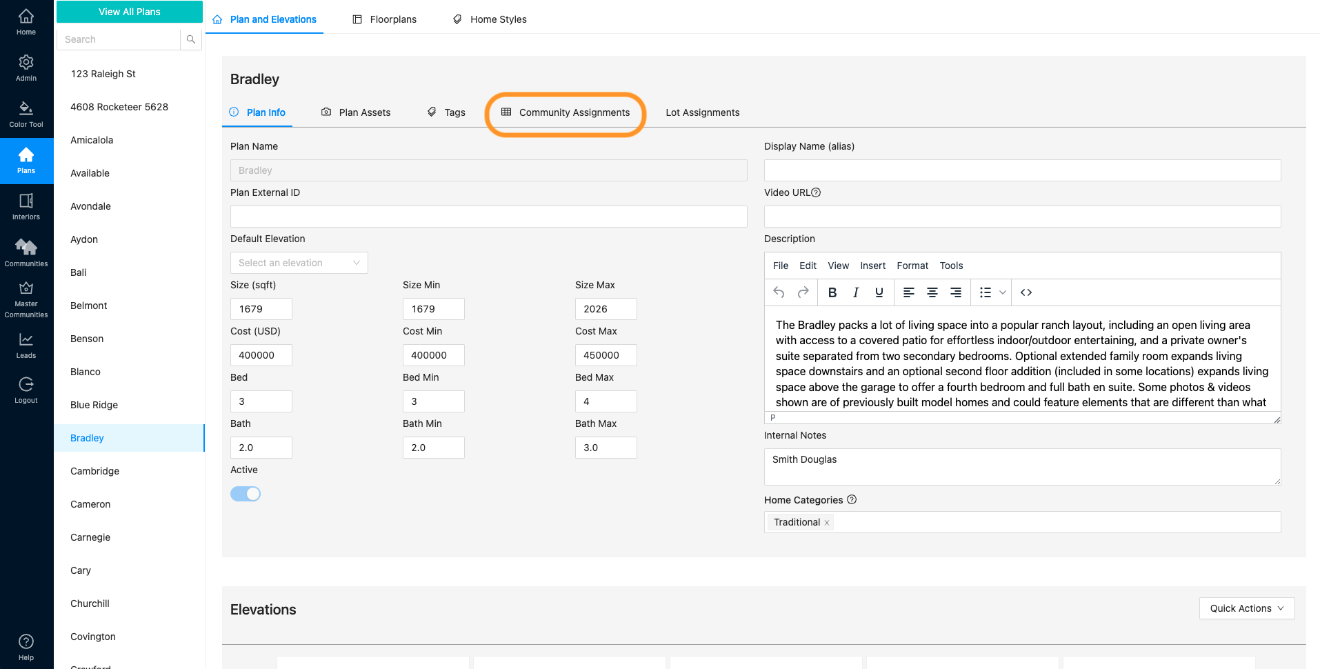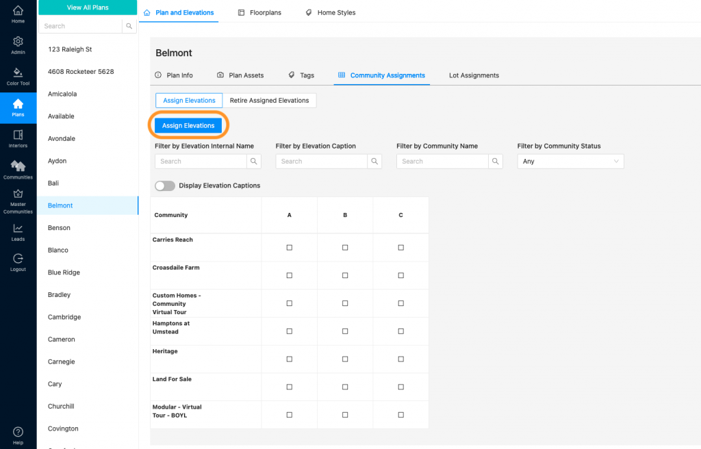 - To assign elevations to communities, go to “Plans” and select the correct plan. This will default to “Plans and Elevations”