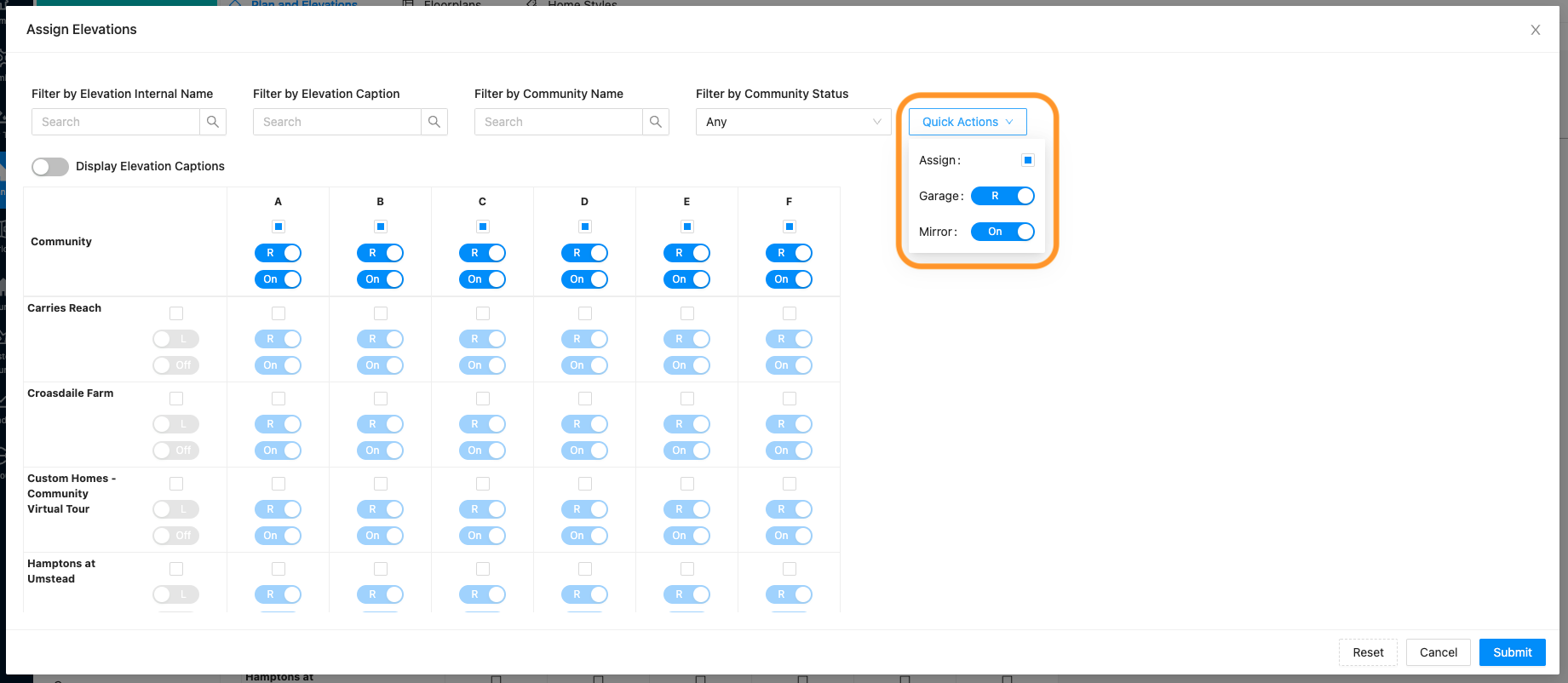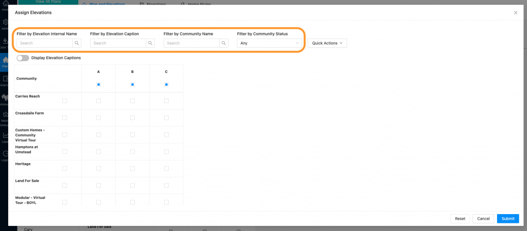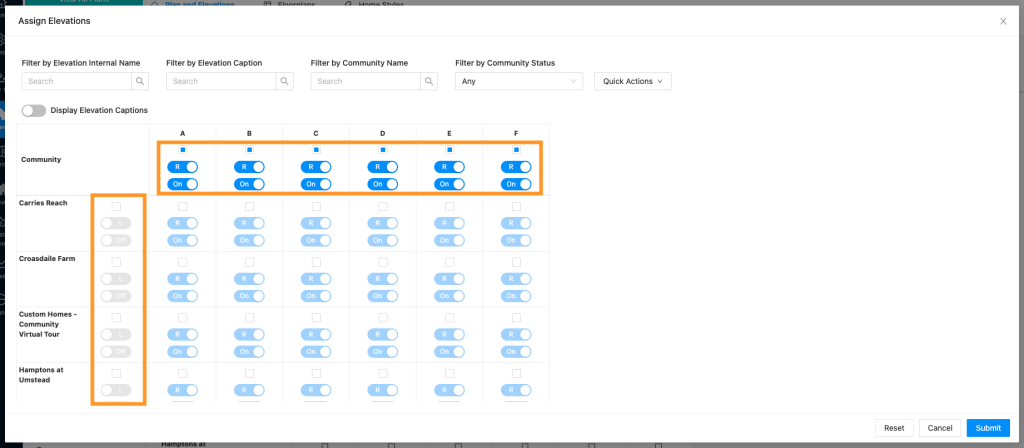 - Here you can see which communities your plans/elevations are assigned to. This table view will look different depending on if you have SVG plans or not.