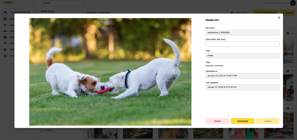 In the preview window, you can view the image details, add a Description (Alternate Text) or Download the image or Delete the image.