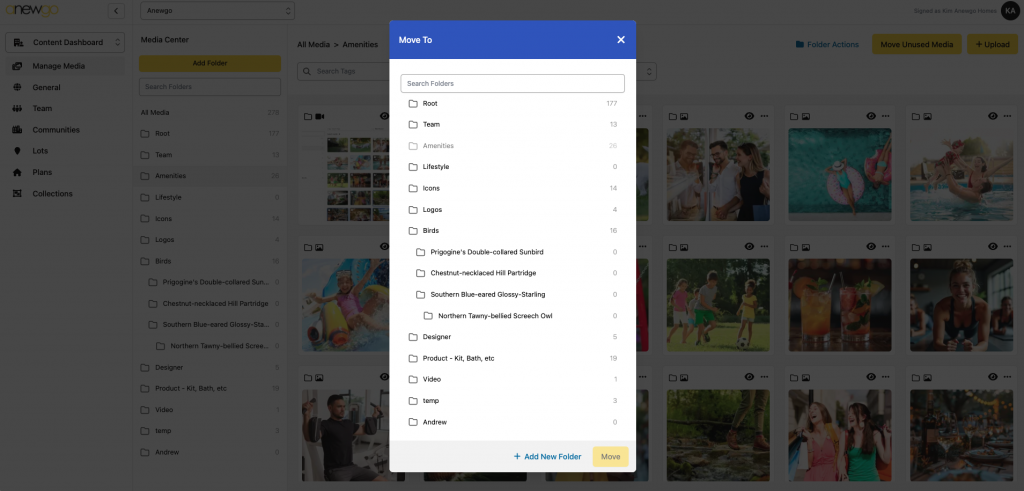 4. Select the Folder where you would like to add the media (use the Search Folders field if needed to find your folder). Then you can click + Upload Media to select files from your device or just drag and drop files to the media section.