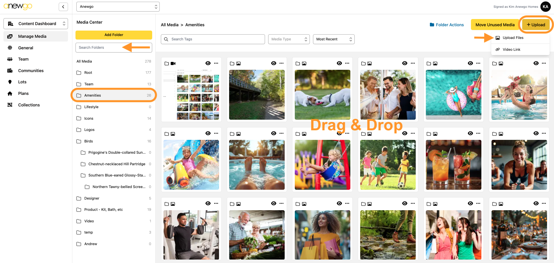 4. Select the Folder where you would like to add the media (use the Search Folders field if needed to find your folder). Then you can click + Upload Media to select files from your device or just drag and drop files to the media section.