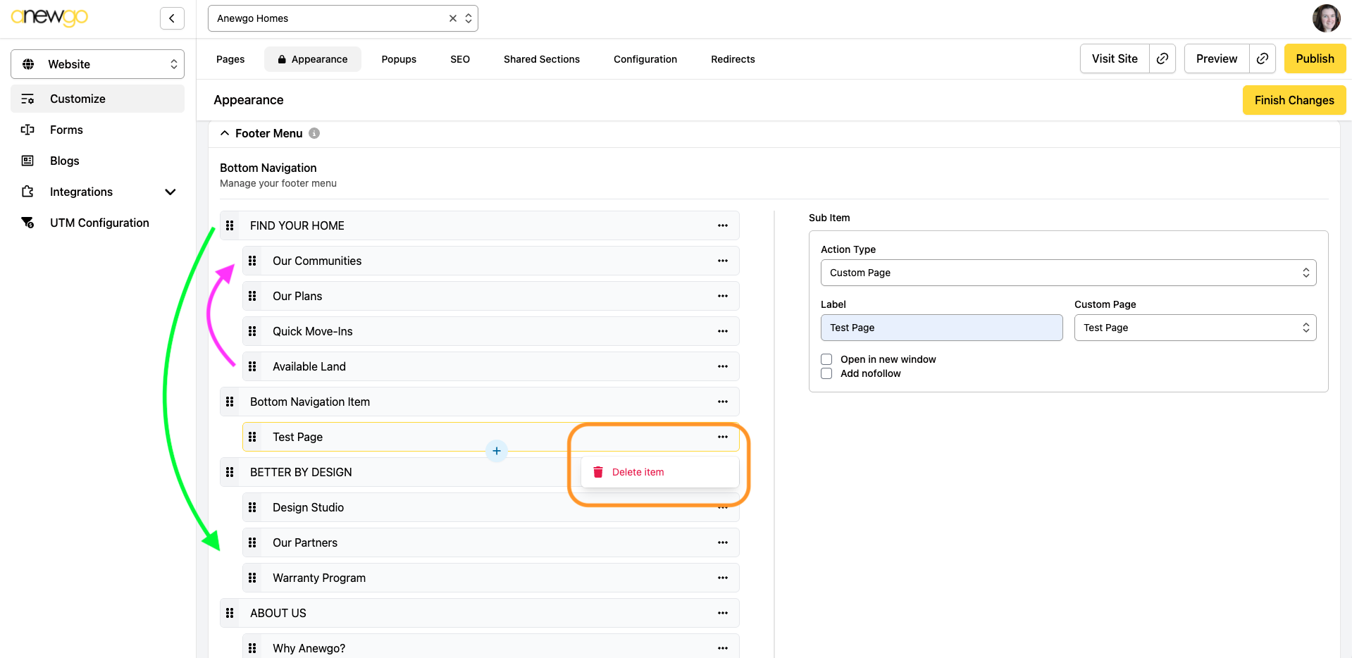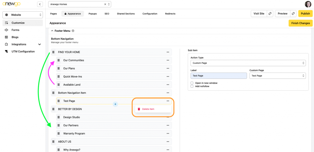 10. You can change the order of the items by dragging and dropping (Note: you cannot move a sub item to a different main section – you can only reorder sub items under 1 main section). You can click the … to delete a menu item.