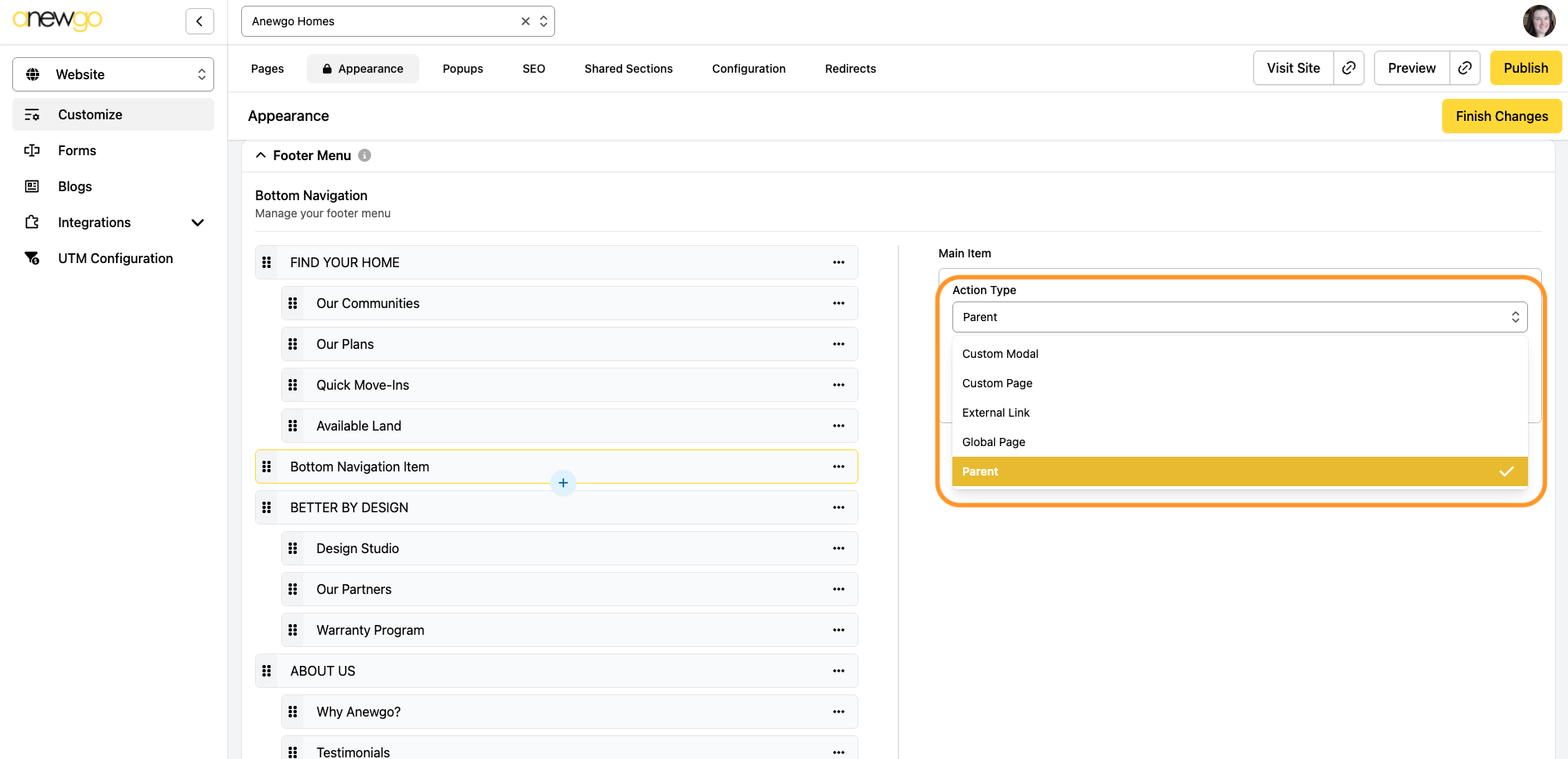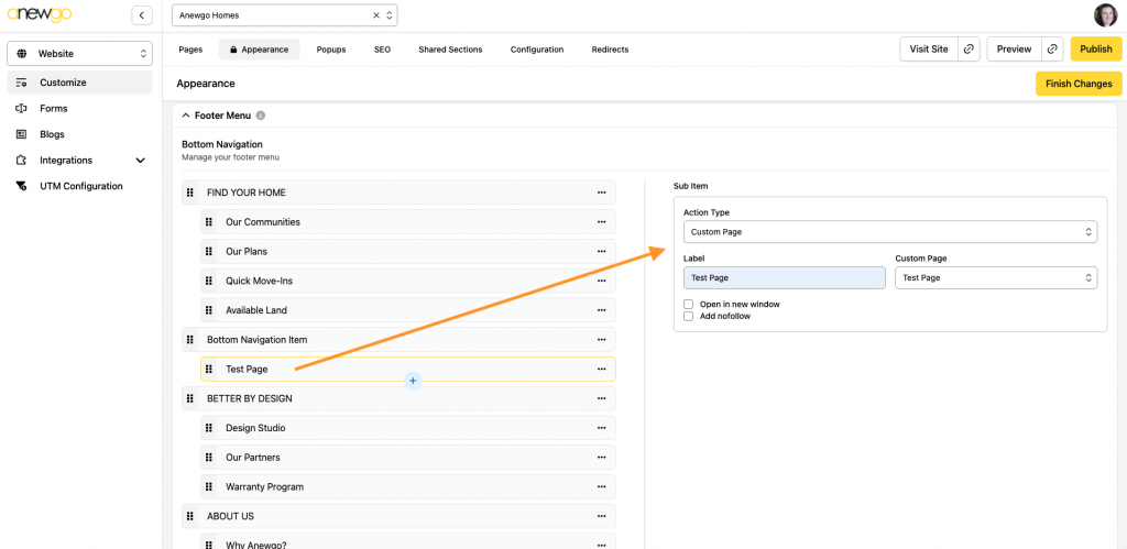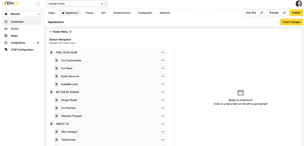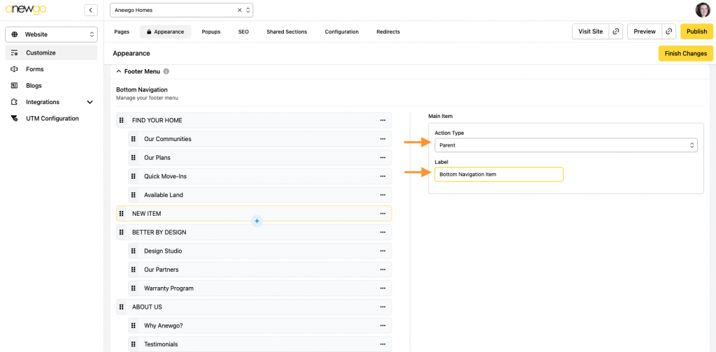 7. The next section is the Footer Menu. This is where you can edit your Bottom Navigation.