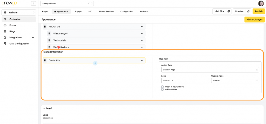 12. The Related Information section works just like the Bottom Navigation area. This section shows in the bottom right of your footer. This area is commonly used for Privacy Practices and Terms of Use.