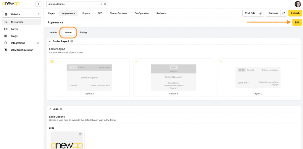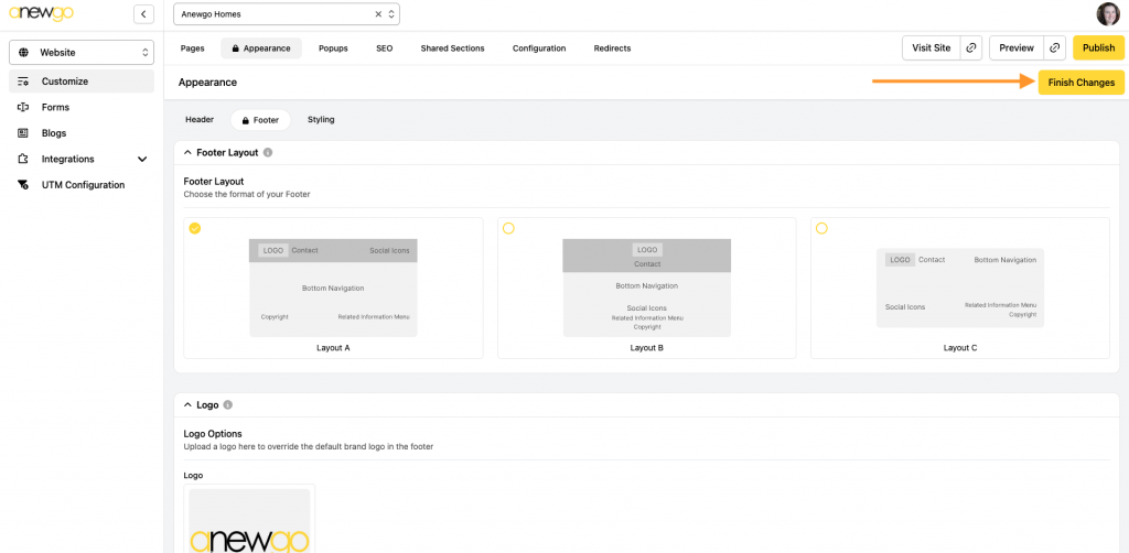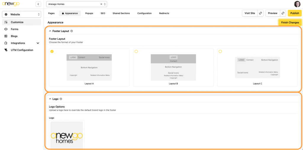 4. The first two sections are the Layout and the Logo. Choose whichever layout you would like and load the logo you would like to use in the footer.