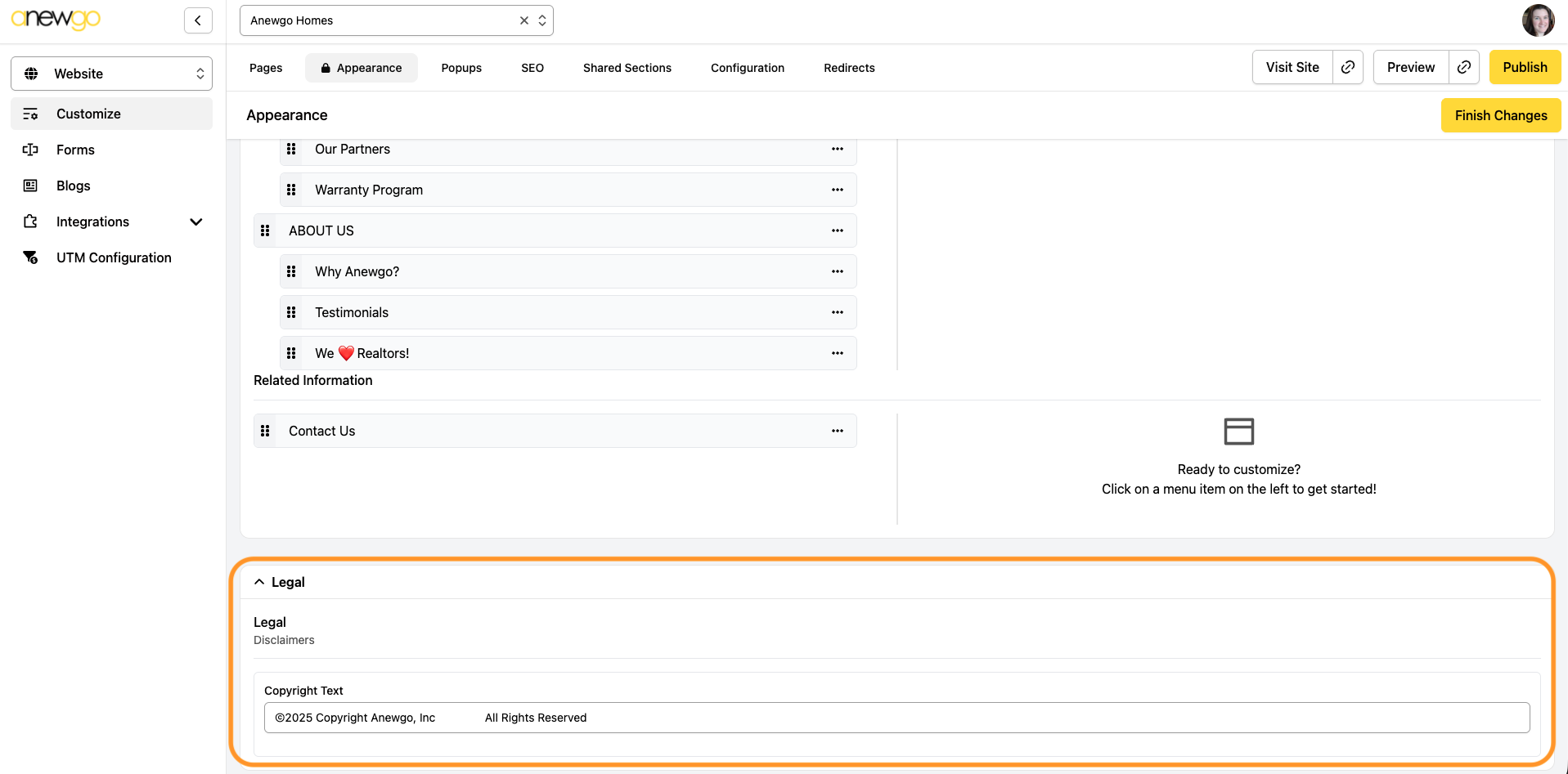 13. The last section is Legal. Here you can add any legal and/or copyright notations.