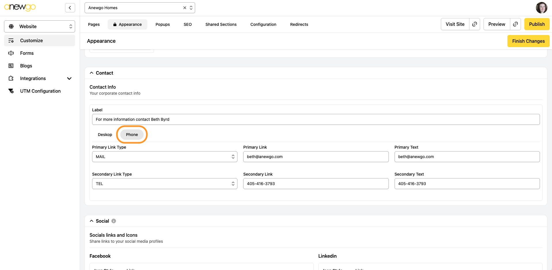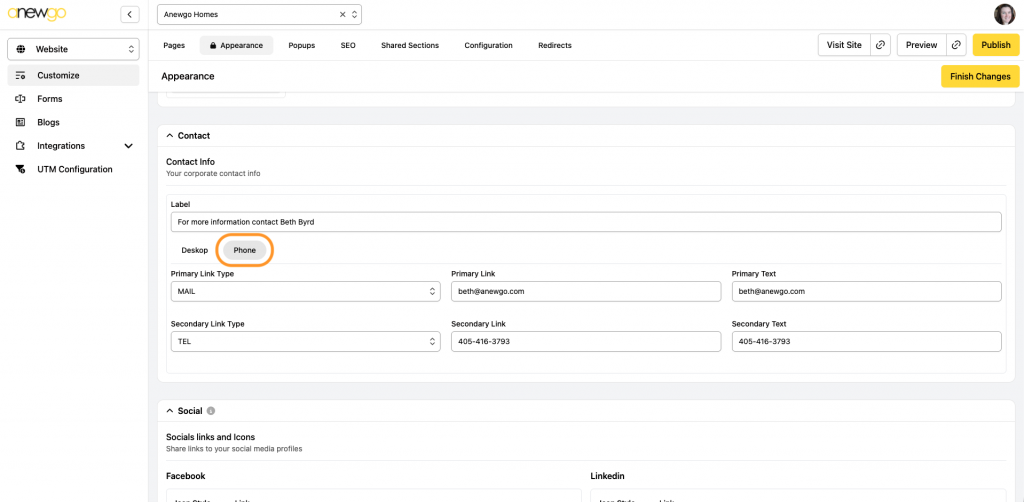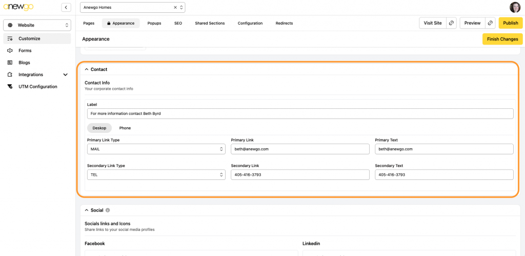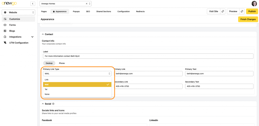 5. The next section is where you can add contact information. Add a Label & Primary Link. You can also add a Secondary link if needed.