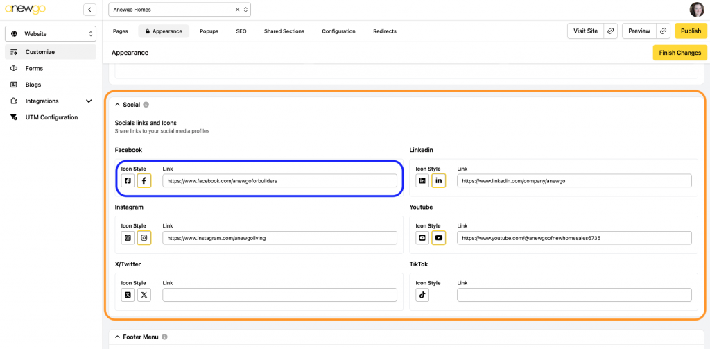 6. The next section is where you can add your social media links. You can select which Icon Style you want to use & add your link to the corresponding social media account.