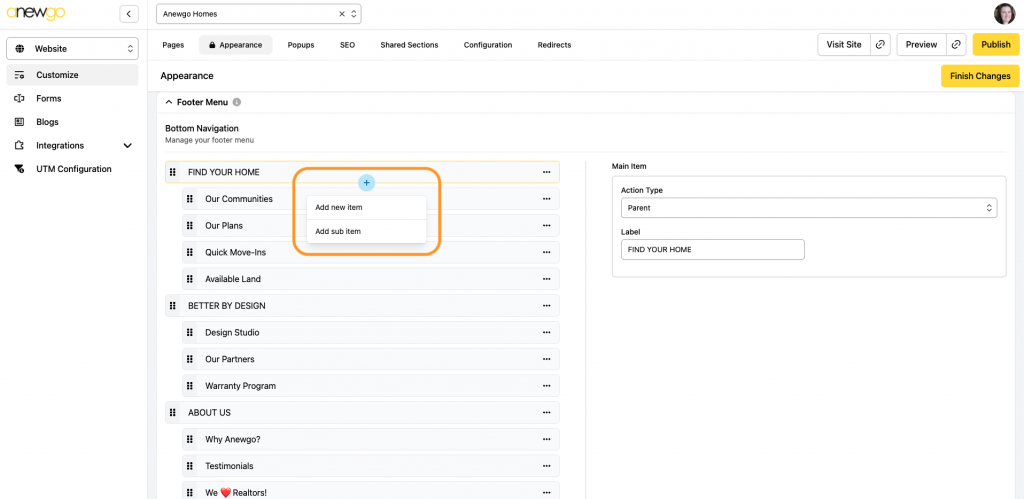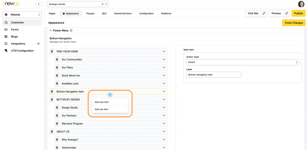 8. To add a new Bottom Navigation item, hover over another main Bottom Navigation item (not a sub item). Click the + sign and select Add New Item.