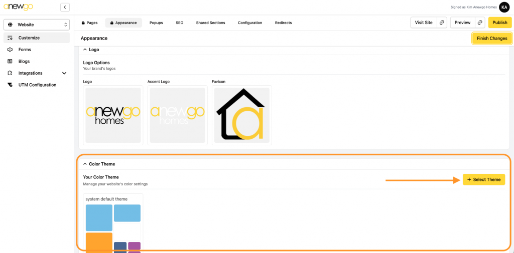 5. In the second section, you can edit your Color Theme. Click +Select Theme to make adjustments.