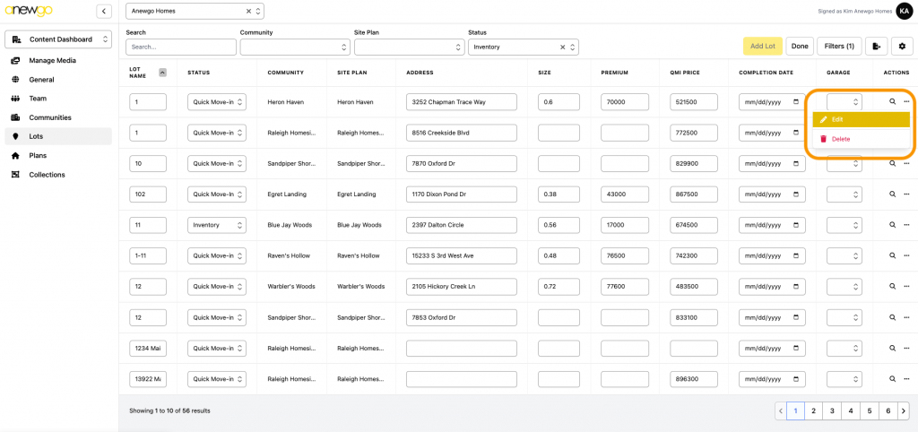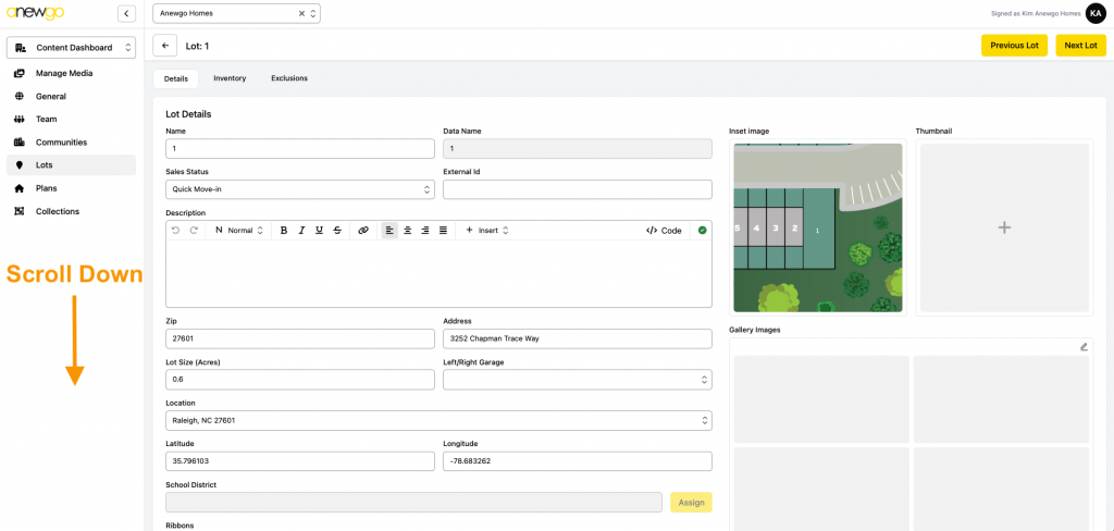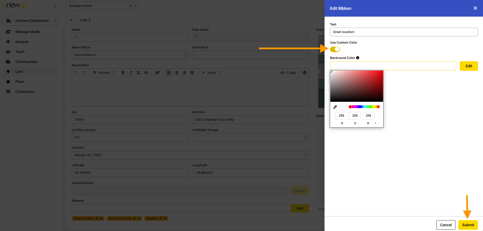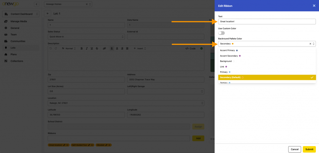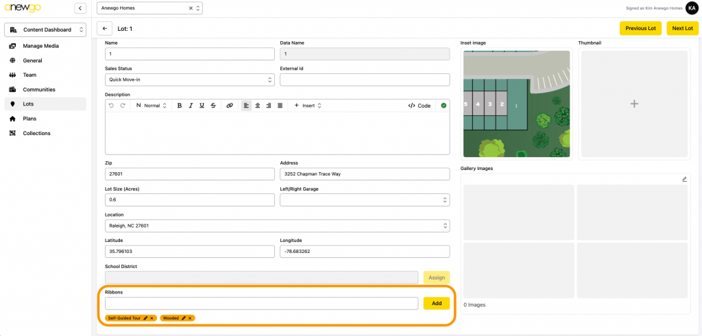 *Note – ribbons can be updated here, but most other updates to Lots still need to be done in the 2.0 backend dashboard (i.e. adding lot info, assigning an elevation, adding photos, etc).