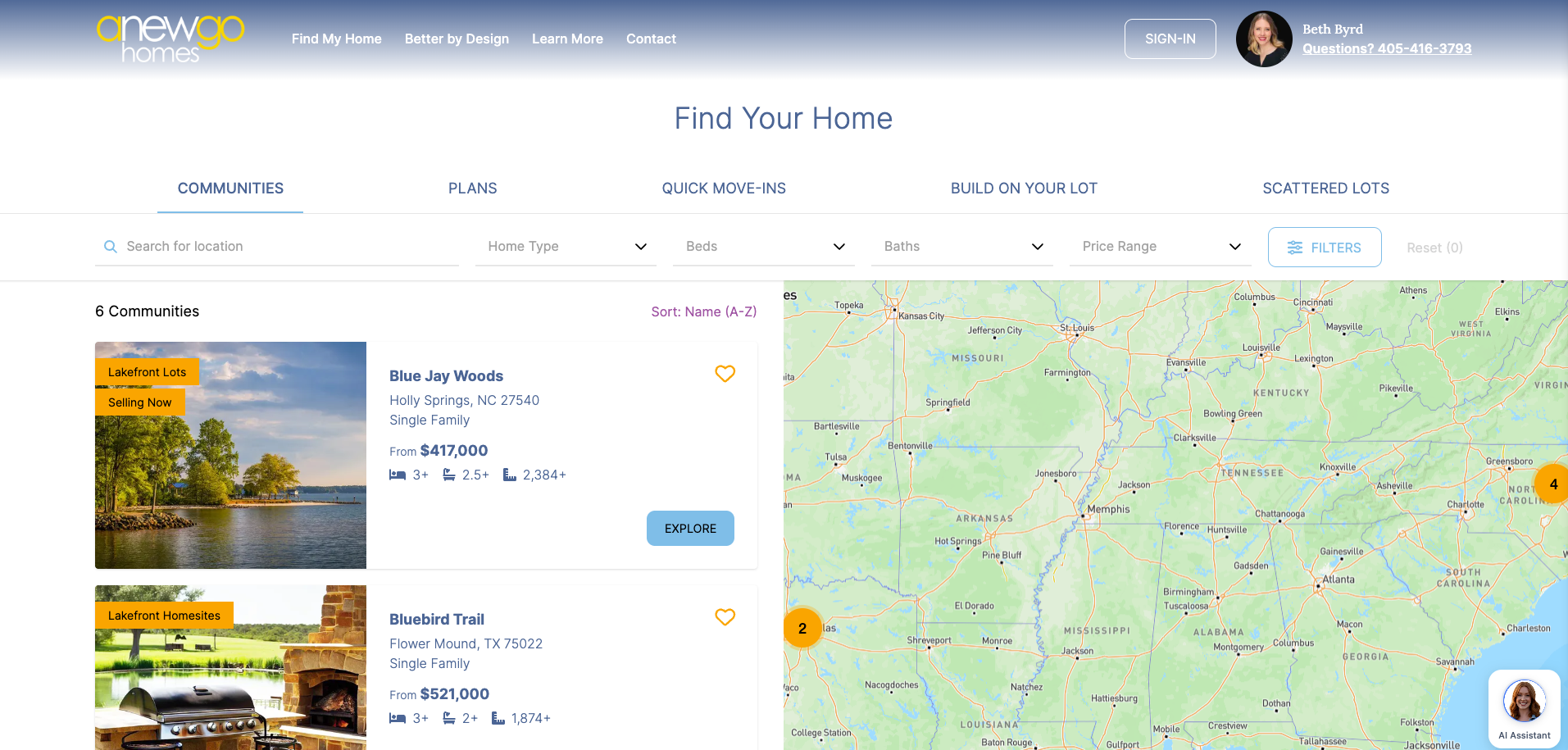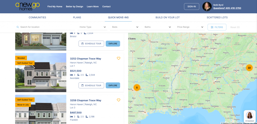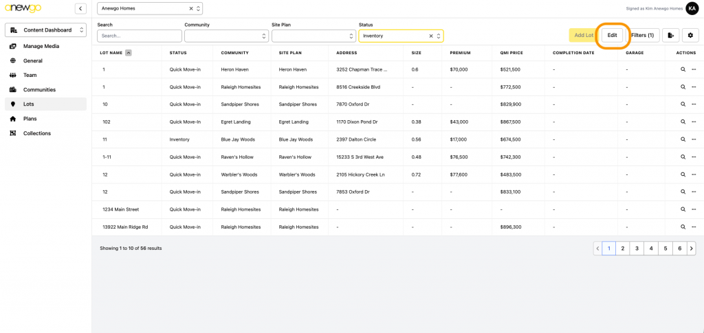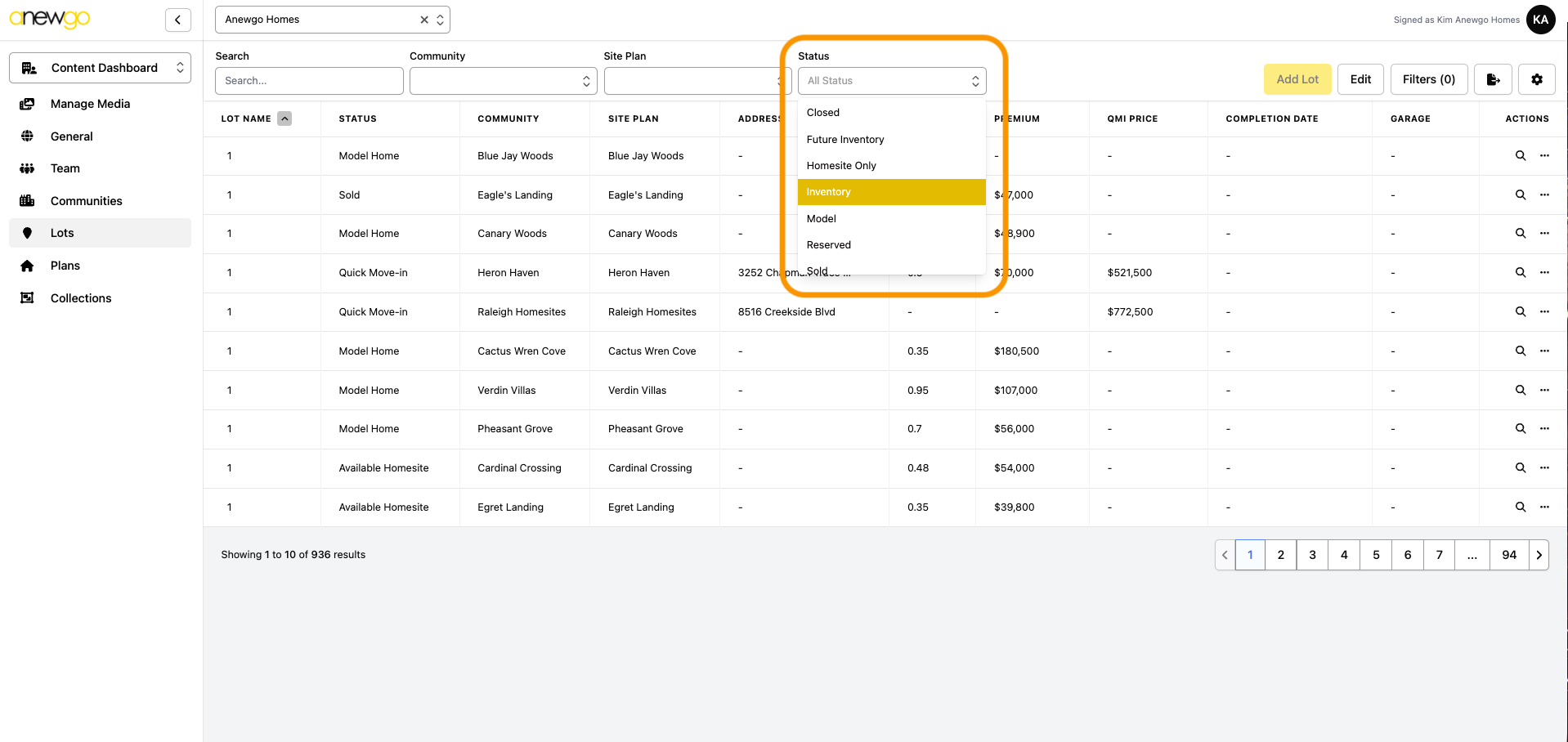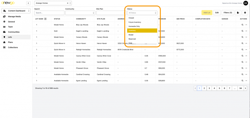 3. Use the filters to find your lot quickly. In this example, we filter to find Inventory homes.