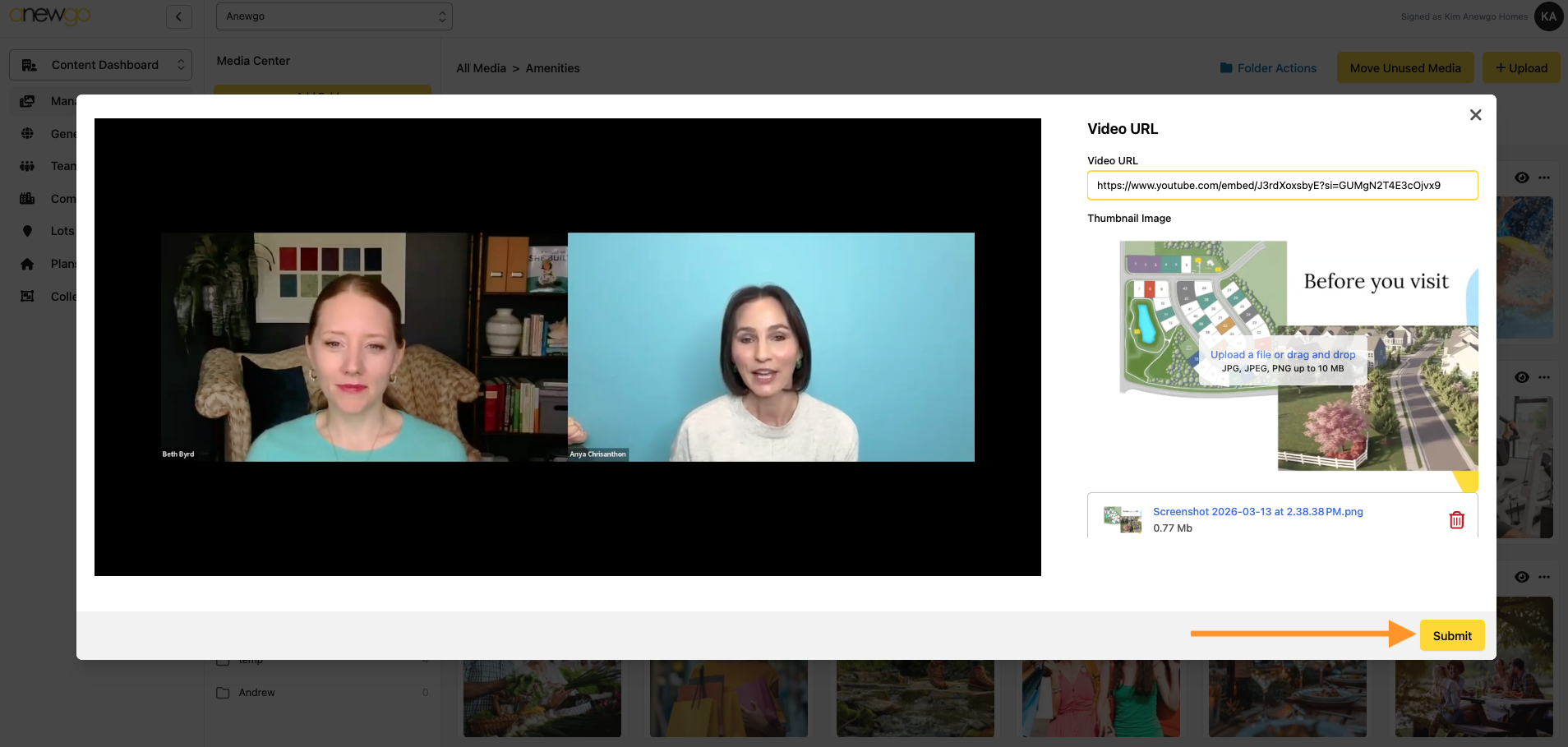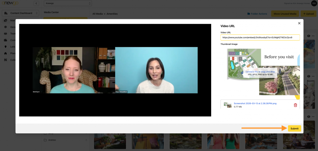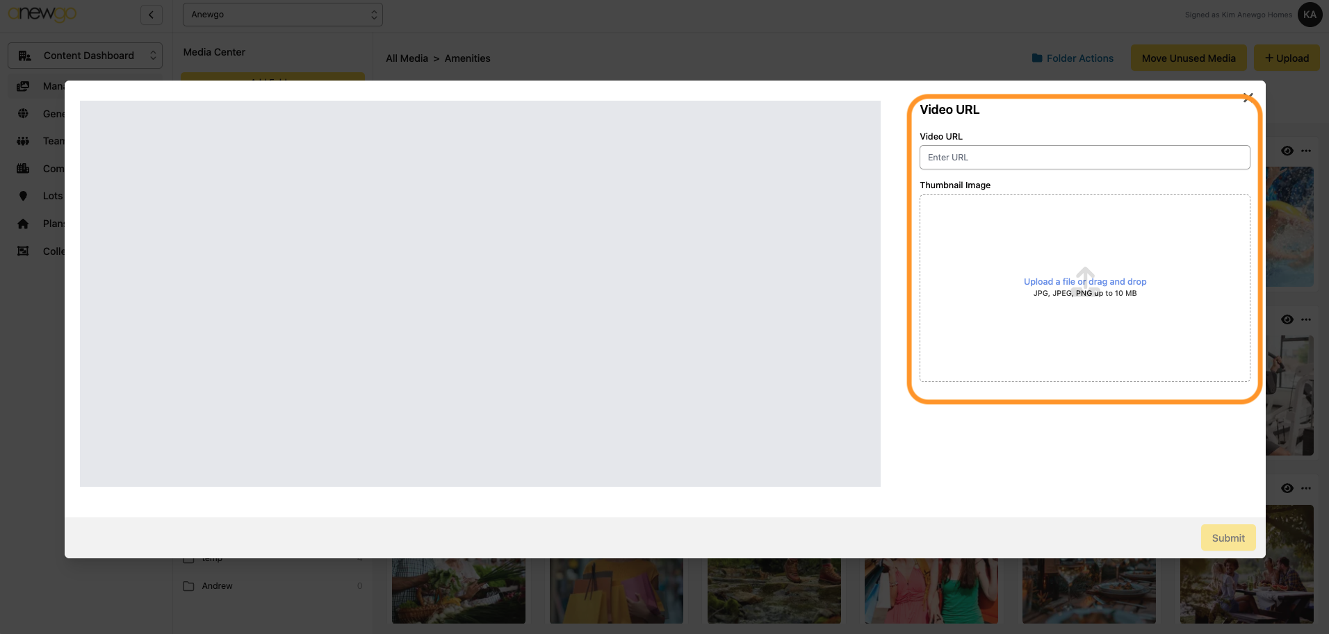 4. Select the Folder where you would like to add the video (use the Search Folders field if needed to find your folder). You can add video files, but the limit is 41.9 MB to make sure your app/website processing is fast. If you cannot compress the video file and you need to use a larger file, you can use a YouTube or Vimeo video link.